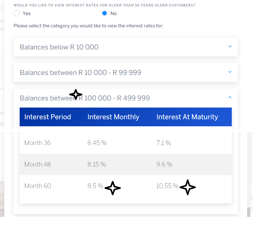 You can choose to see interest rates for customers younger or older than 55 years. The interest rates also differ depending on your investment amount. You will find the 10.55% interest rate under the R100 000 - R499 999 category.
